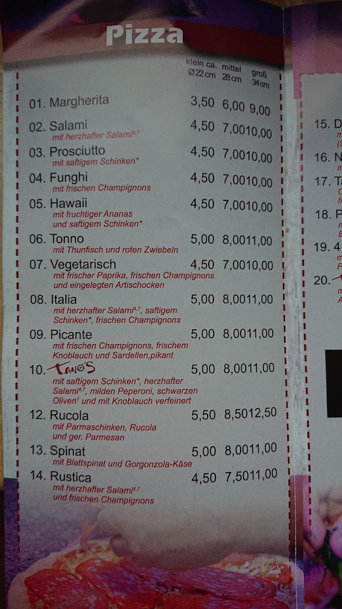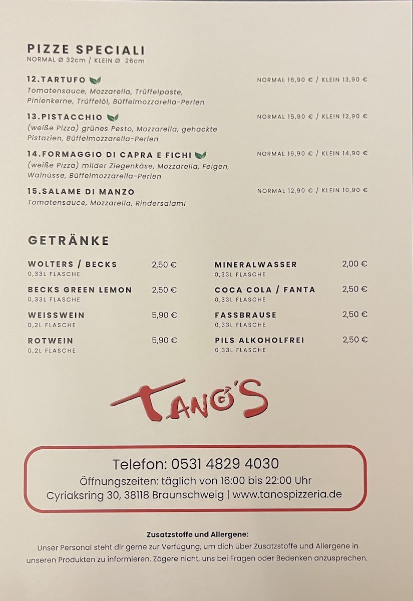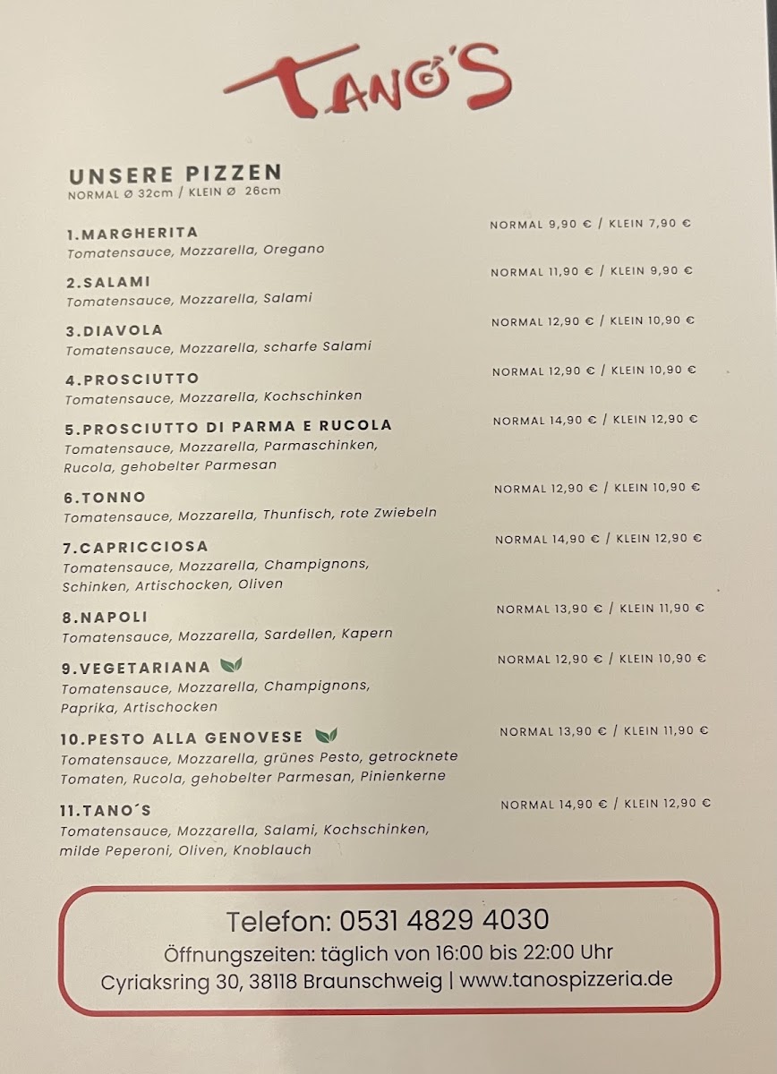 At Pizzeria Tano's Menu, you'll find a delightful selection of traditional Italian pizzas that bring a taste of Italy right to the heart of Braunschweig. Whether you're in the mood for a classic Margherita, a rich Quattro Stagioni, or something a little more adventurous, their menu has something to please every palate. Each pizza is crafted with the finest ingredients, from the perfect dough to the freshest toppings. Beyond the pizza, the menu also offers mouthwatering sides and delicious desserts, making it a complete dining experience. Whether you're grabbing a quick bite or enjoying a leisurely meal with friends, Pizzeria Tano’s offers a cozy and welcoming atmosphere that’s perfect for any occasion. The menu is designed to cater to all tastes, with options for both meat lovers and vegetarians, ensuring everyone can find their perfect slice.